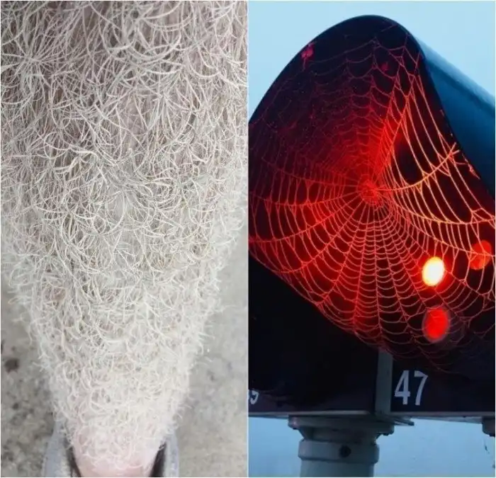 2. Слева: «Моя нога покрыта каменной пылью после 15 минут работы по резке камня». Справа: туманное утро, светофор и паутина