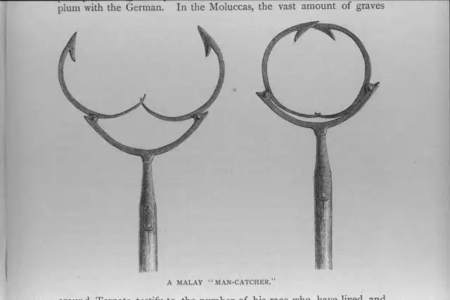 Это оружие носит название мэнкетчер (в переводе с английского - «человеколов»). Это металлический захват, который первоначально использовался для того чтобы сбросить с лошадей закованных в латы всадников, не вступая с ними в близкий бой. Он использовался в Европе на протяжении нескольких столетий, но утратил свою эффективность с появлением огнестрельного оружия. Тем не менее, мэнкетчер применяли вплоть до конца 18 века, когда с его помощью ловили беглых преступников.