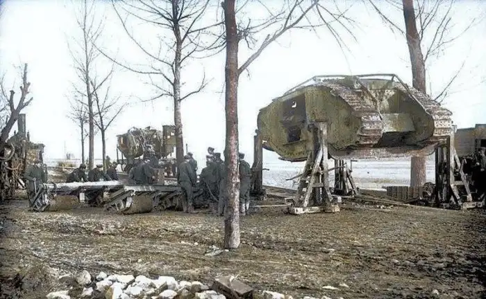 Ноябрь 1917 года. Немецкие солдаты пытаются поставить захваченный ими британский танк на рельсы, не понимая, как правильнее его использовать. По иронии судьбы, во время Второй мировой немецкая армия долго будет считаться в Европе непобедимой в танковых сражениях.