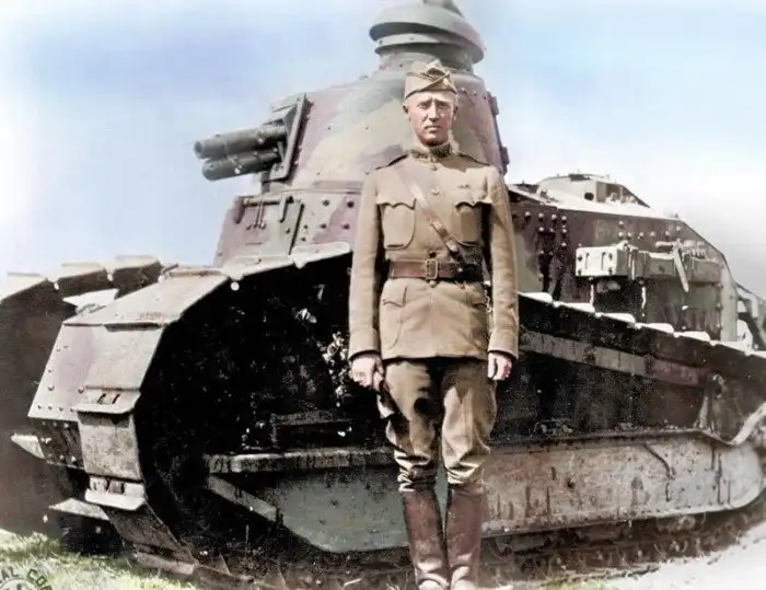 Подполковник армии США Джордж Смит Паттон - огромный энтузиаст танков, интересовавшийся ими еще тогда, когда о них мало кто знал на фронтах. В апреле 1917-го, после присоединения США к войне, Паттон был назначен руководителем программы по внедрению танков в американской армии. Впоследствии Паттон дослужится до генерала, а во время Второй мировой считался лучшим в США экспертом по танкам. На фото - Паттон у французского танка Renault летом 1918-го года.