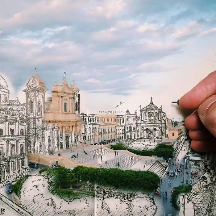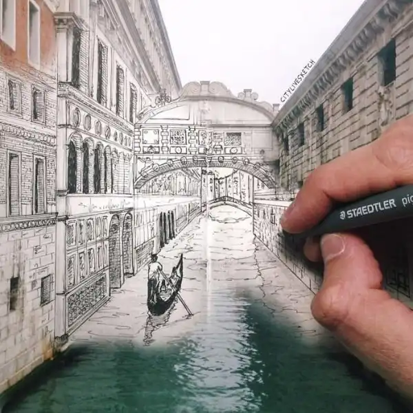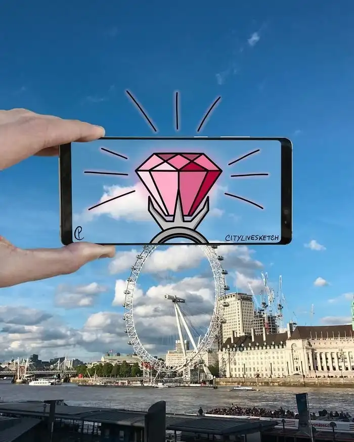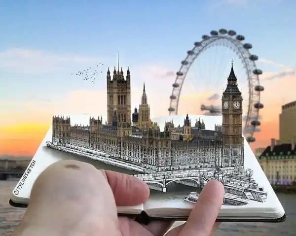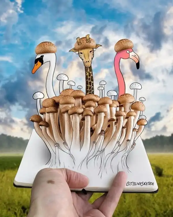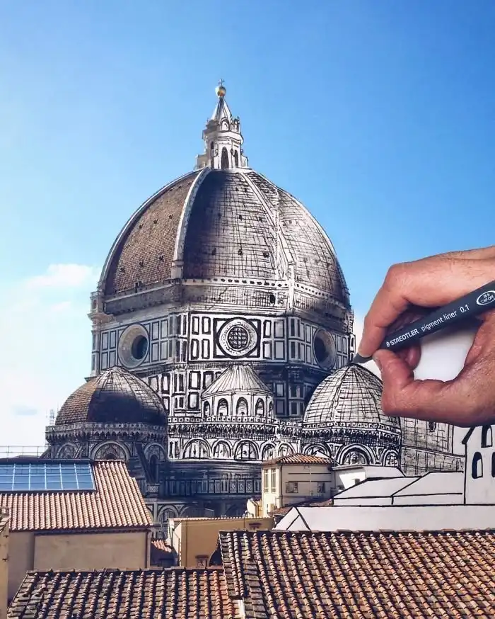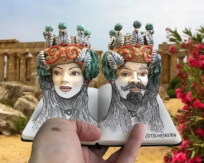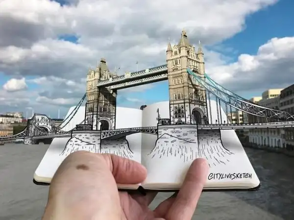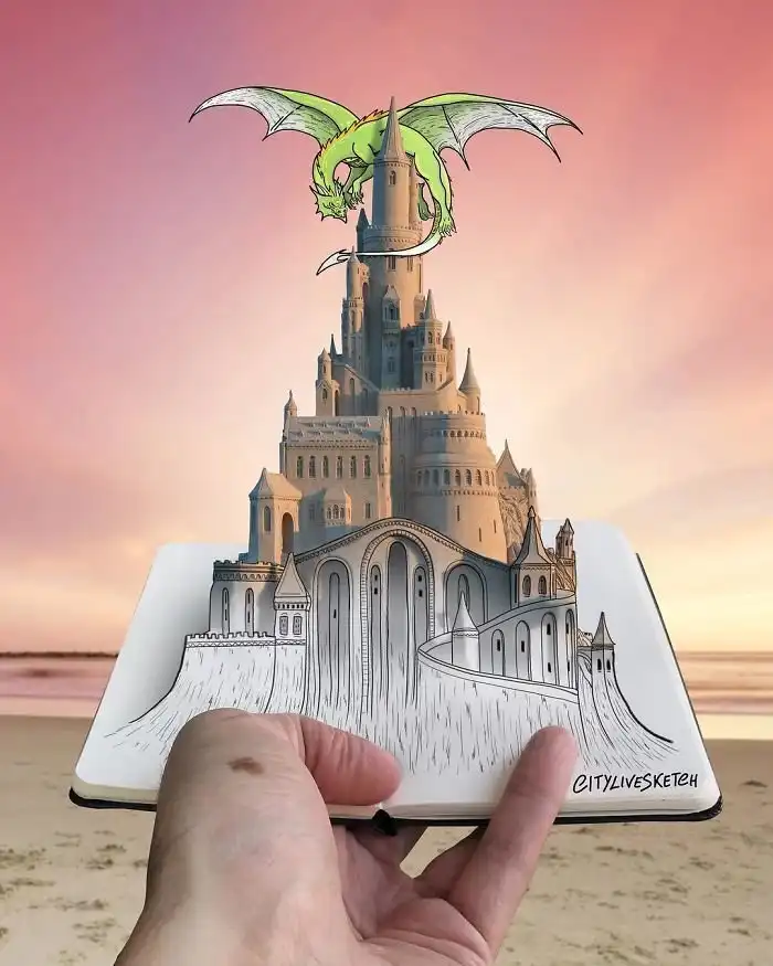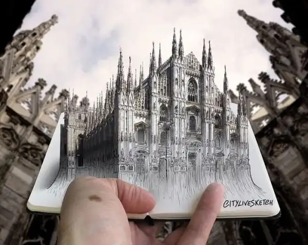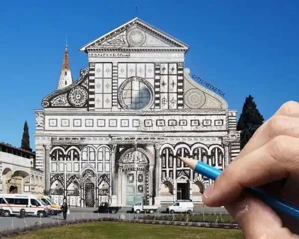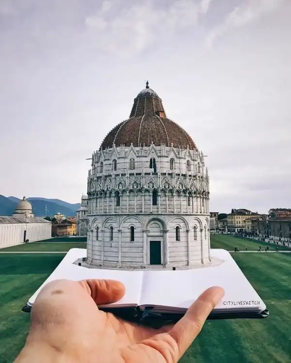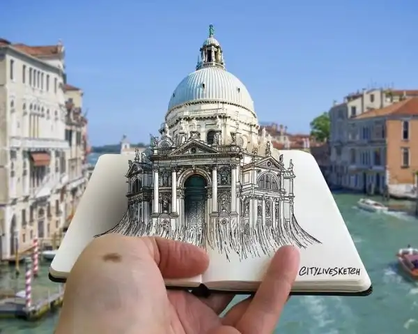 Художник из Италии Пьетро Катаделла создает новую реальность, совмещая фотографии из поездок со своими рисунками. В своей серии работ "Городские зарисовки" он накладывает наброски зданий, людей и предметов, которые делает в блокноте, на фото тех мест, которые вдохновили его на рисунок. В результате получаются необычные 3D-работы, открывающие перед зрителями новую реальность, созданную талантом художника.