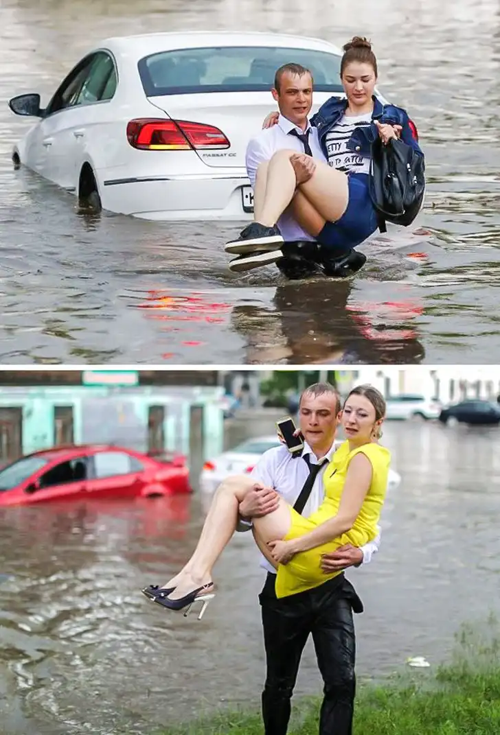 Ливень затопил улицы, и машины этих девушек залило водой. Парень помог им выбраться