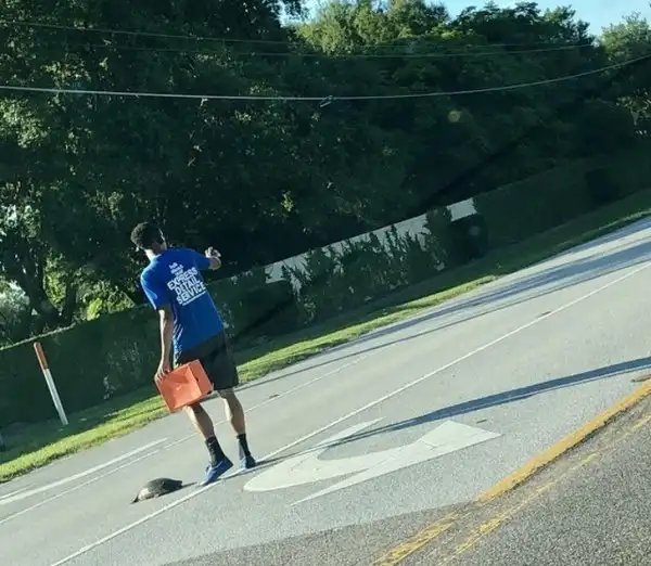 Парень помог черепахе перейти через дорогу, подавая знаки автомобилям, чтобы те не наехали на нее