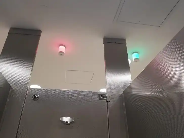 Лампочки в туалете аэропорта, которые показывают, какая кабинка занята
