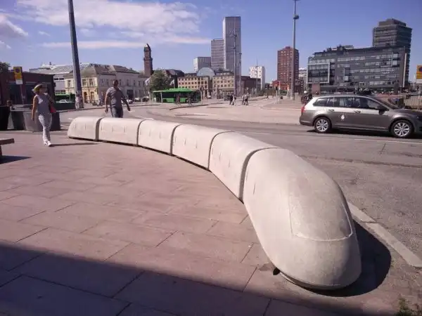 Скамейки рядом с вокзалом сделаны в форме поездов
