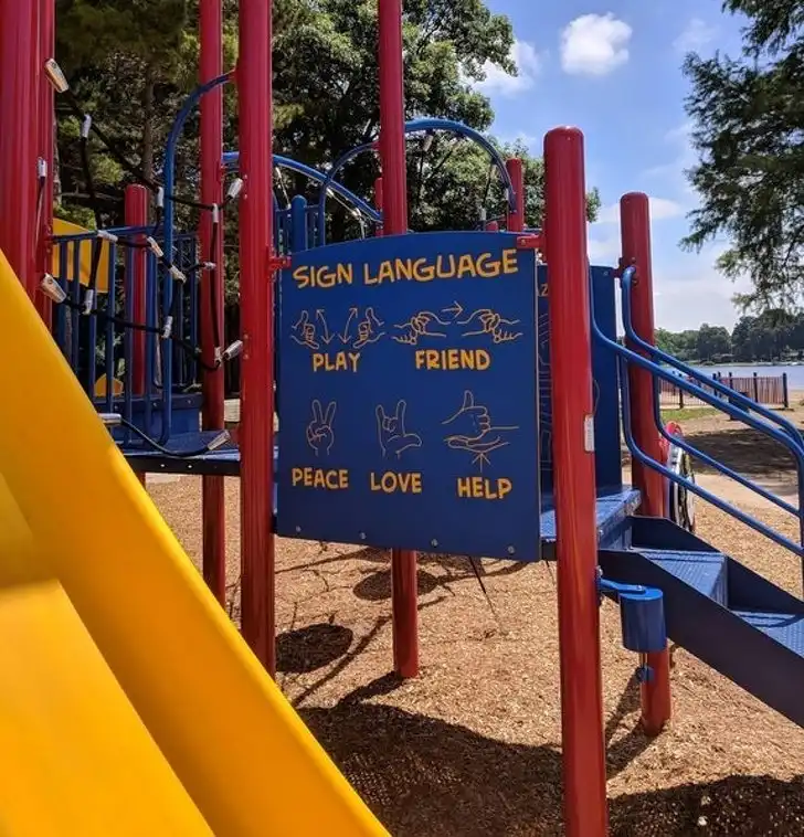 На этой игровой площадке установлен знак, помогающий общаться с детьми, у которых проблемы со слухом