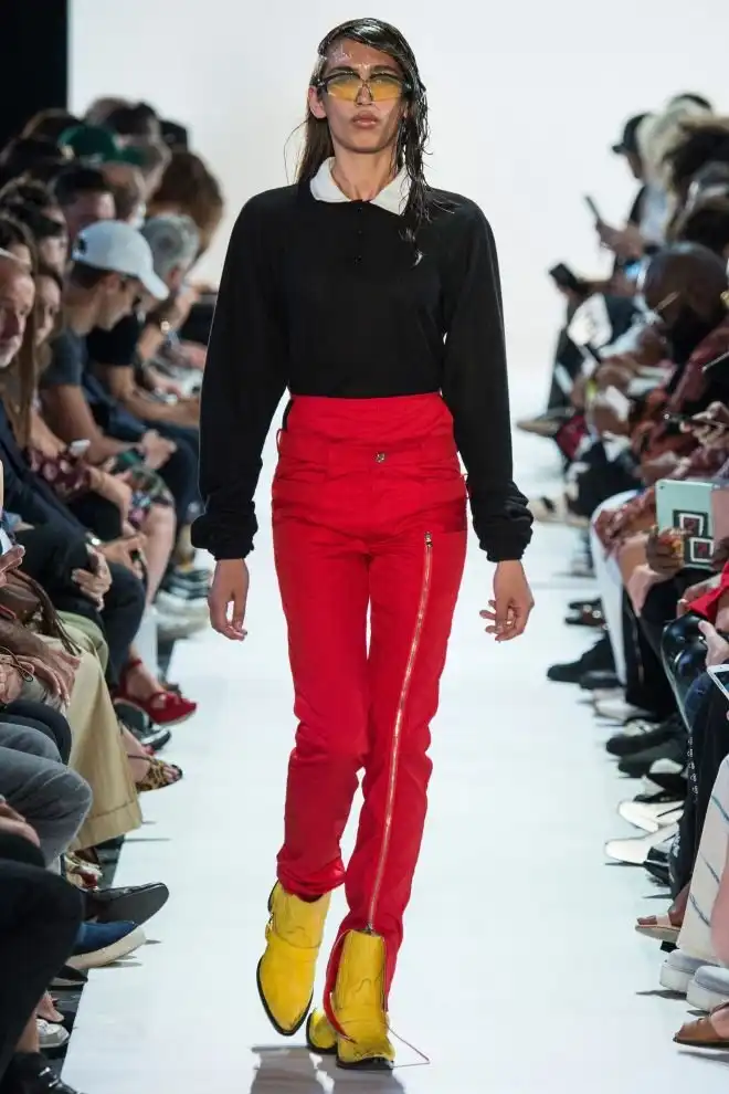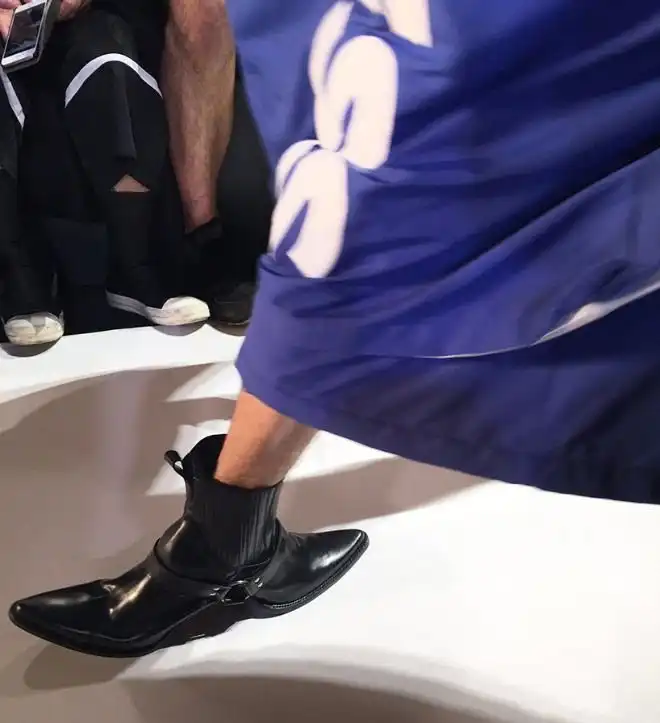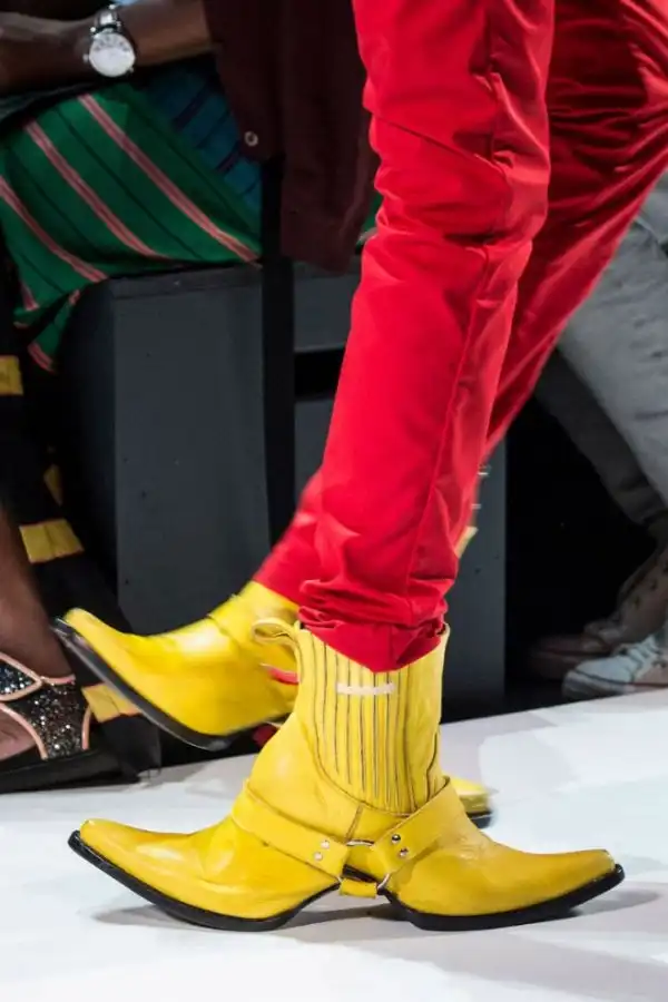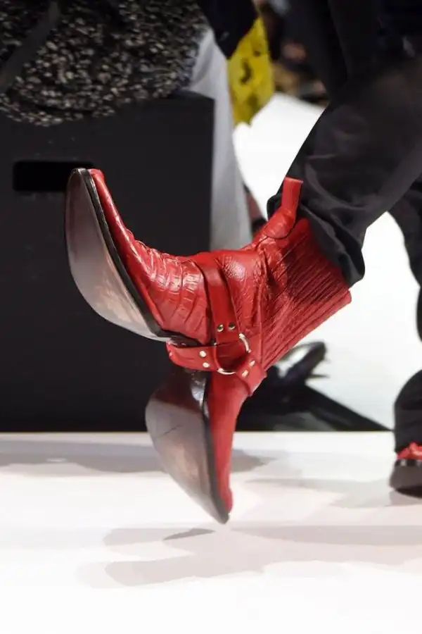 Модельер Шейн Оливер выпустил на подиум моделей в плодах своей больной фантазии: ковбойских сапогах с двумя носками, "смотрящими" в разные стороны. Это выглядит куда уродливее, чем ковбойские сандалии с голенищем.