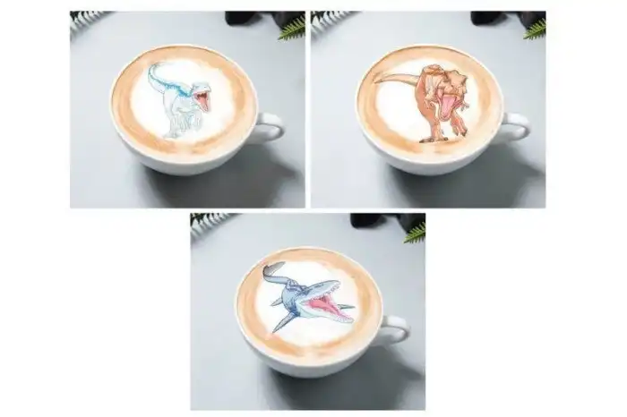 Из напитков - латте с изображениями динозавров, газировка с существами, плавающими в стакане, и смузи, украшенные "ископаемыми".