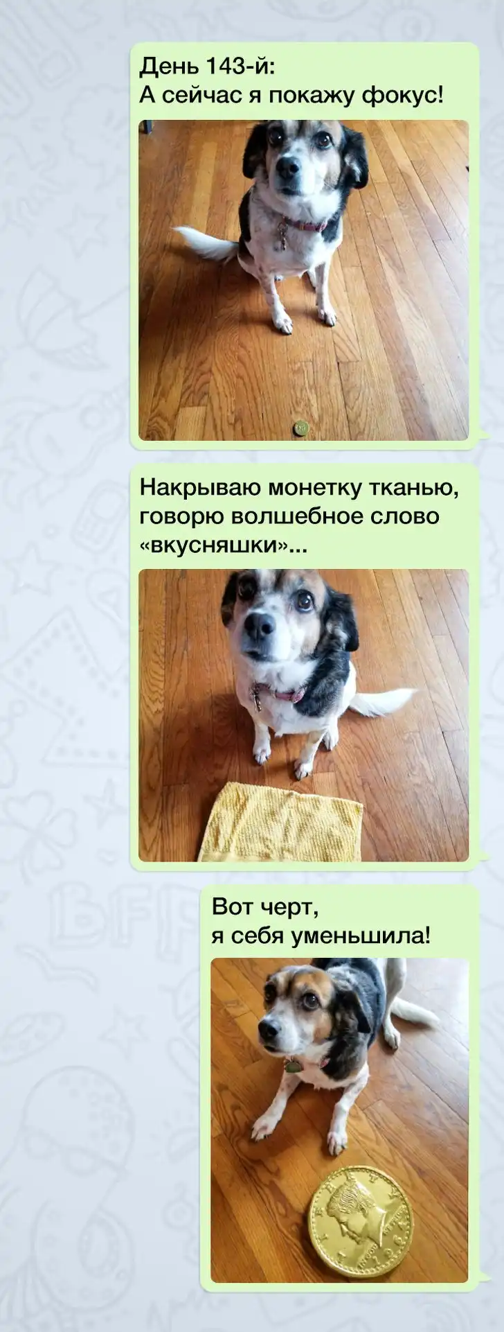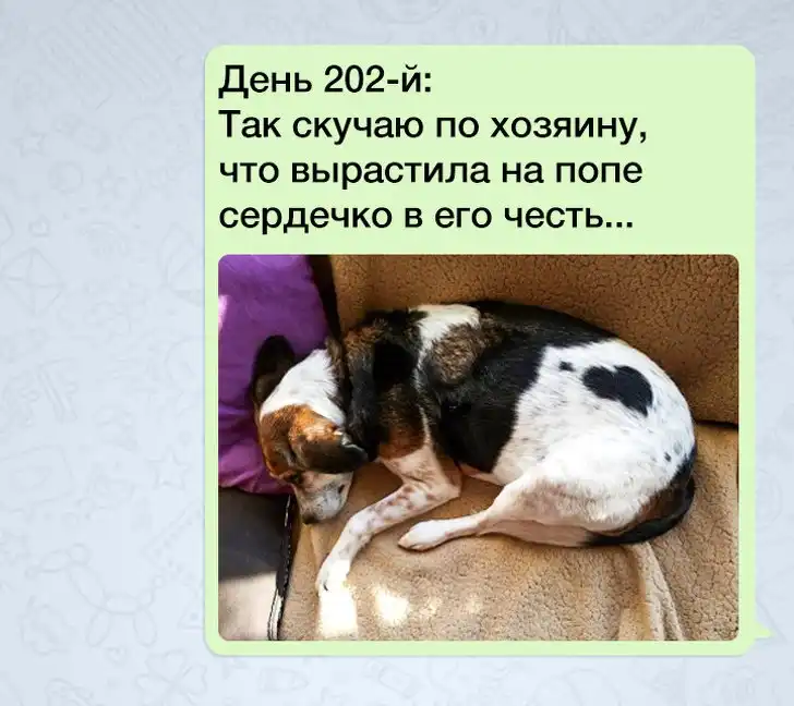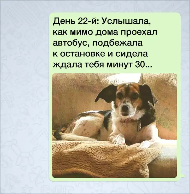 Собака много значила для своего хозяина: чтобы научиться ответственности, парень по указанию отца целый год «выгуливал» поводок по 2 раза каждый день. Нетрудно представить, как он был рад наконец получить питомца и с каким тяжелым сердцем ему пришлось прощаться со своим пушистым другом. Чтобы подбодрить сына, мама отправляла ему фотографии собаки с милыми подписями в течение года, не пропустив ни одного дня.