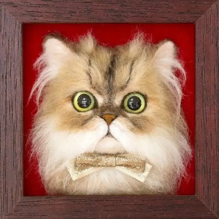 Для своих работ художник использует шерсть разных цветов, создавая войлочные 3D-портреты кошек. Это очень кропотливая и деликатная работа, которая отнимает у мастера много времени, но потрясающий итоговый результат стоит всех этих усилий.
