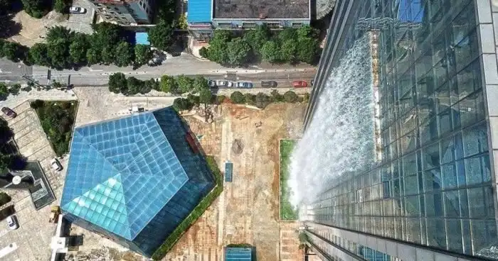 В китайском городе Гуйян было построено уникальное здание, по одной из стен которого стекает водопад. По свежей информации, высота небоскреба составляет 121 метр, а вода падает с высоты в 108 метров.