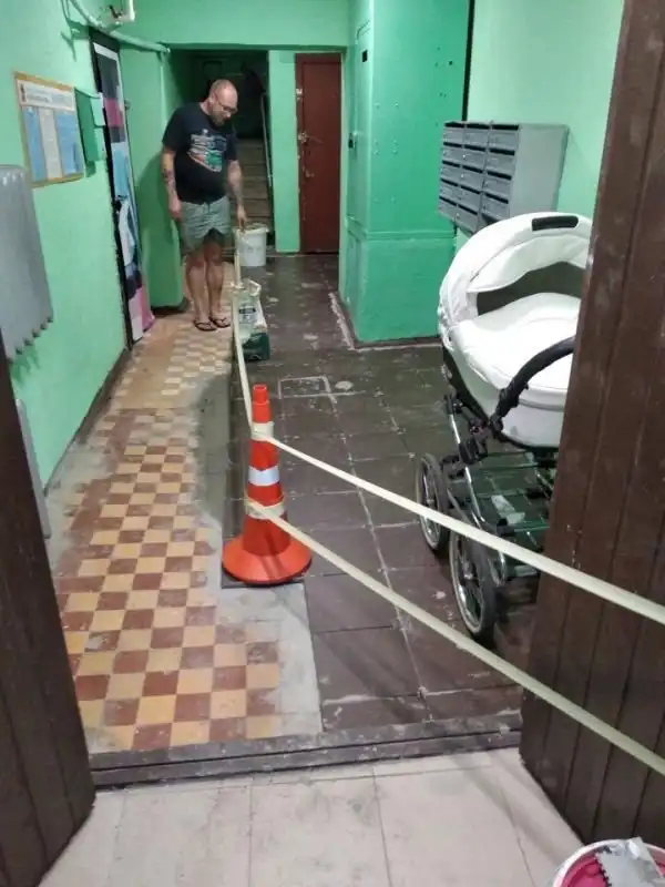 В то время, как в прошлом многие люди запросто клеили новые обои на старые, чтобы обновить дизайн своего жилища, то эти рабочие удивили своим подходом к укладыванию новой плитки. Если подобный ремонт повторить еще пару раз, всего через лет 20 можно будет тут целый "культурный" пласт снимать, ведь высота помещения будет уменьшаться с каждой такой укладкой плитки.