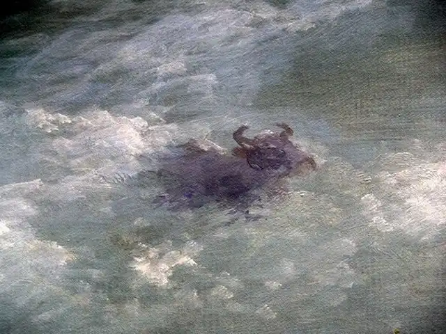 В правом нижнем углу картины можно увидеть корову на волнах, а это означает, что где-то неподалеку есть берег, следовательно, у людей имеется шанс на спасение. Ну, что тут еще добавить? Глядя на картину в учебнике, вы бы точно этого не увидели. Поэтому нужно иногда посмотреть на произведения искусства своими глазами, если у вас появляется такая возможность.