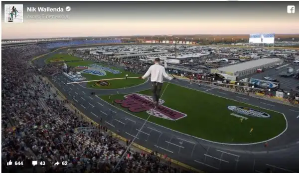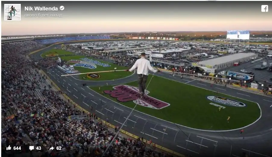 Акробат Ник Валленда идет по канату над стадионом без страховки