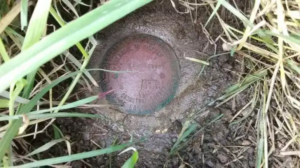 Этот люк, скрытый под грязью и травой, отмечает точный северо-западный угол Техаса