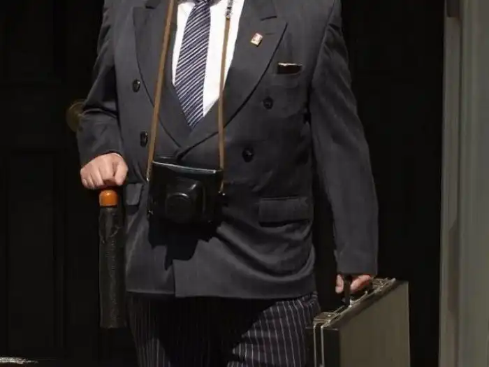 Превью: фото джентльмена со шпионскими камерами, встроенными в зонт, портфель, костюм, пачку сигарет и фотокамеру.