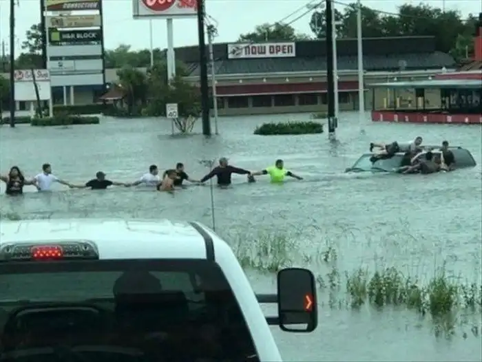 15. Люди объединились во время наводнения, чтобы вытащить семью из затопленной машины