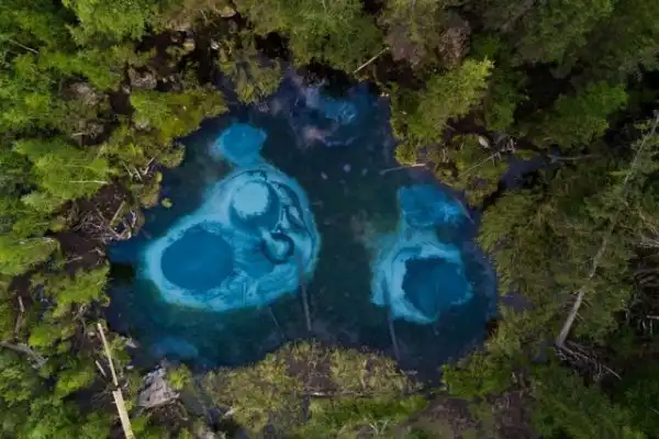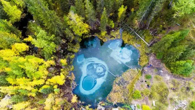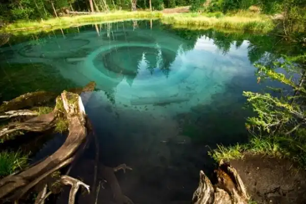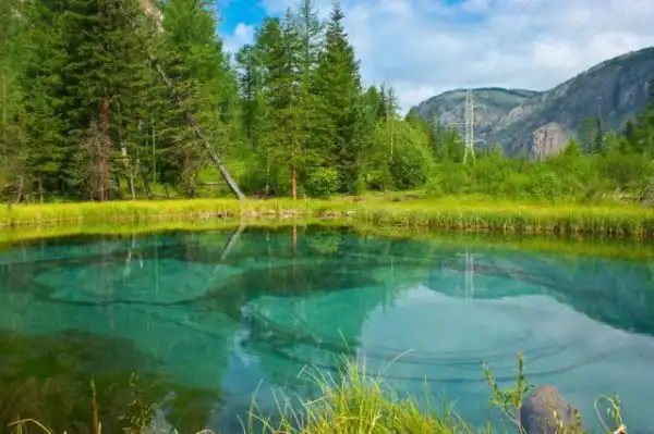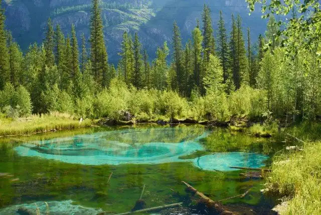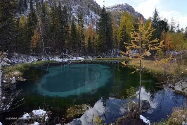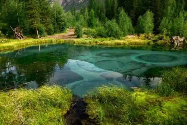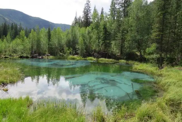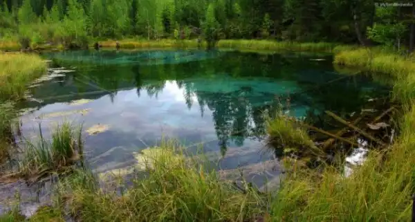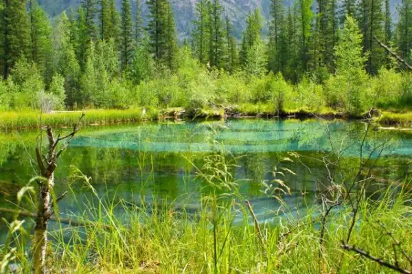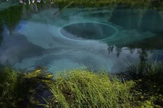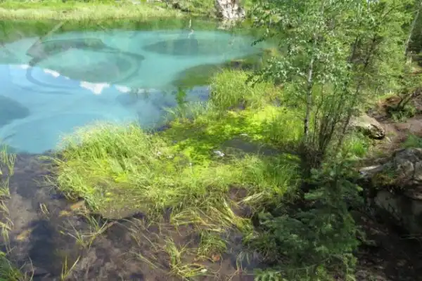 Это озеро удивительной красоты находится неподалеку от села Акташ в Горном Алтае, а его основной изюминкой является бирюзовый оттенок посредине из-за голубой глины на дне. Иногда из его недр происходят гейзерные извержения, которые и являются источником глины голубого цвета, формирующие причудливые узоры на дне.