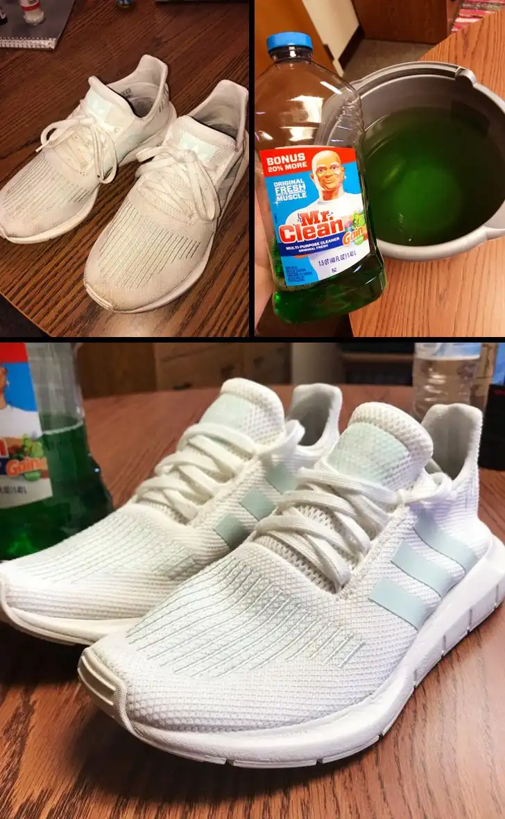Замочите на ночь грязные кроссовки в смеси чистящего средства для стекол и воды и наслаждайтесь результатом