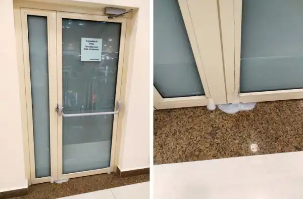 Комната в торговом центре с табличкой «Посторонним вход воспрещен». Каждый вечер сотрудник клининга убирает что-то из-под нее шпателем