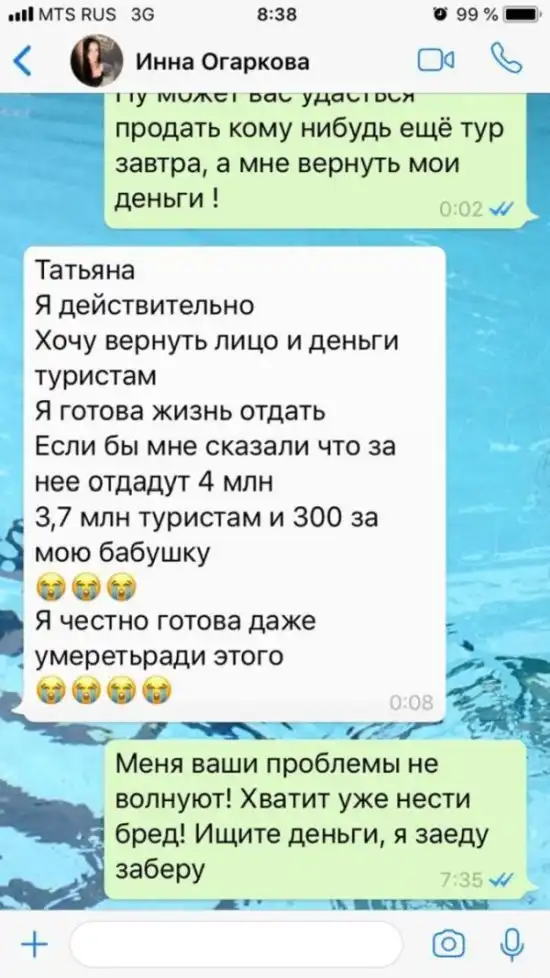 Одна из клиенток "Студии туризма" пишет: "Мы покупали своим родителям тур во Вьетнам. Очень долго копили деньги на поездку, за которую отдали Инне 183 тысячи рублей. Что самое интересное, часть средств мы перевели по ее просьбе на ее личную карту, а часть передали наличкой. За три недели до выезда начали звонить в турагентство, но там никто не брал трубку. Несколько дней спустя нам сообщили, что у фирмы проблемы, и в итоге вернули всего 40 тысяч рублей."