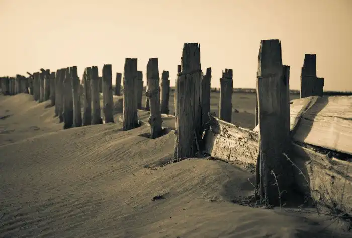 Сейчас на месте бывших соляных бассейнов остались лишь деревянные столбики да сухая земля, сильно напоминающая пустыню, но именно это сочетание и привлекло мое внимание.