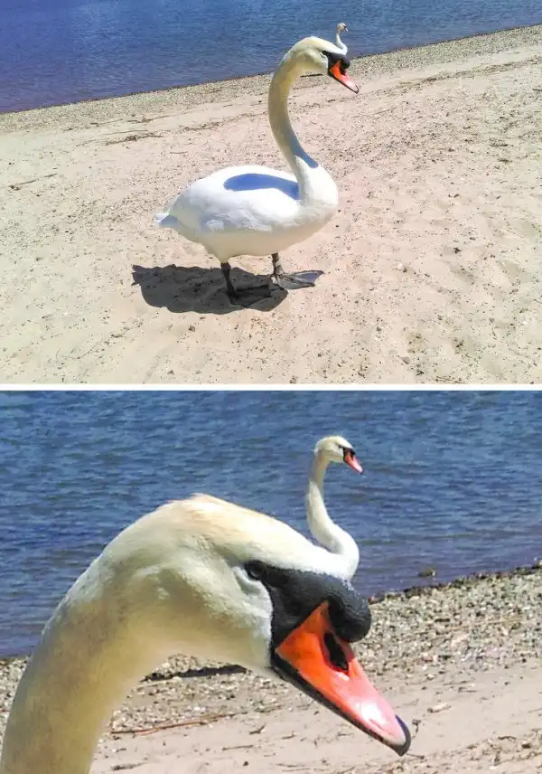 Удачный кадр: лебедь с маленьким лебедем на голове