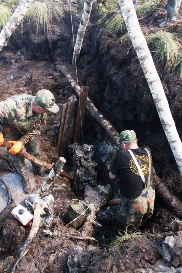 Как выяснилось, самолет не могли извлечь из земли из-за слишком теплых зим, ведь болото и грязь просто не промерзали достаточно, чтобы на место крушения можно было доставить технику. В результате падения тяжелый двигатель ушел в топь на 4,5 метра, но теперь удалось извлечь из-под земли и его. Внутри также были обнаружены останки пилота.