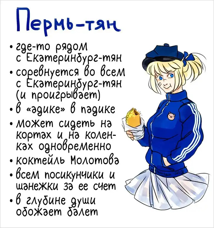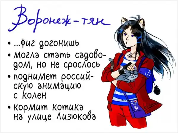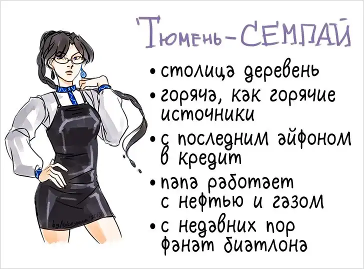 Художница Екатерина, родом из Екатеринбурга, под псевдонимом MagnieMakoyana выложила у себя в твиттере изображения некоторых российских городов в образе героев аниме. Для каждого населенного пункта девушка не только придумала образ, но и очертила собственный характер. Ее рисунки быстро разлетелись по сети, ведь на таких персонажей и правда интересно взглянуть.