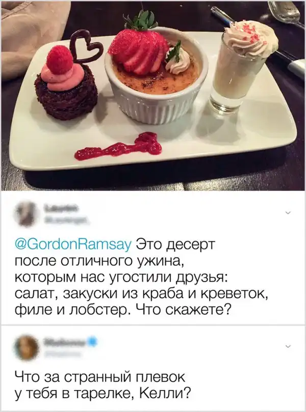 Благодаря интернету мы можем задать вопрос кому угодно. Где еще тебе ответит знаменитый британский шеф-повар, чьи рестораны в сумме удостоены 16 звезд Мишлен? Вот и пользователи твиттера решили не мешкать и предложили Гордону Рамзи оценить их блюда.