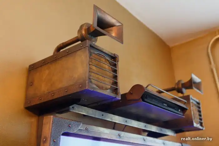 Теперь телевизор в медном «чехле», все кнопки рабочие (их дизайн был позаимствован у духовых музыкальных инструментов). Единственная бутафория на нем — расположенный рядом с клавишами змеевик, это просто украшение.
