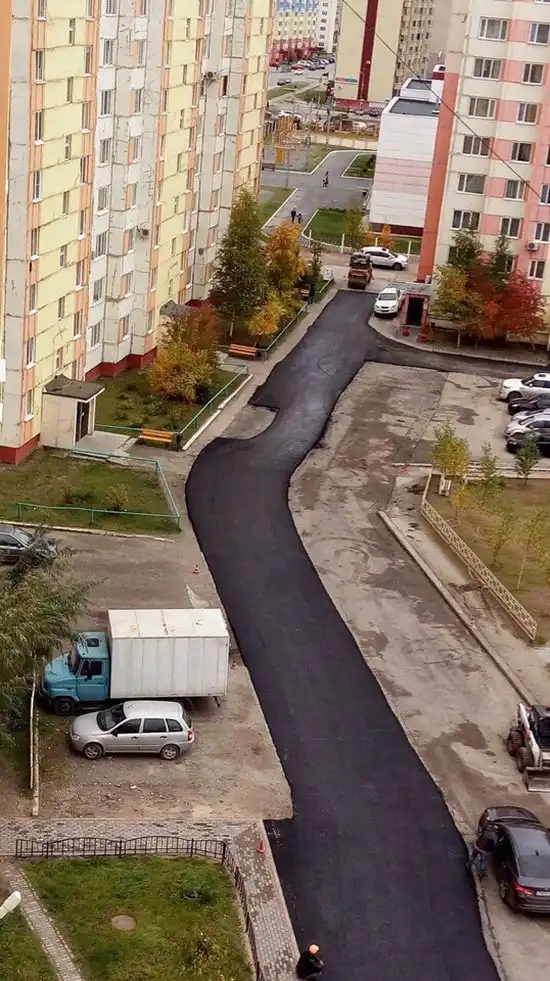 Несмотря на объявления, заблаговременно предупреждающие жителей о предстоящих дорожных работах, многие водители игнорируют требования убрать свой личный транспорт. Так и получилось в этом дворе, где дорожники укладывали новый асфальт. Они не стали вызывать эвакуатор и оставили всё, как есть. Как говорится, и так сойдет.