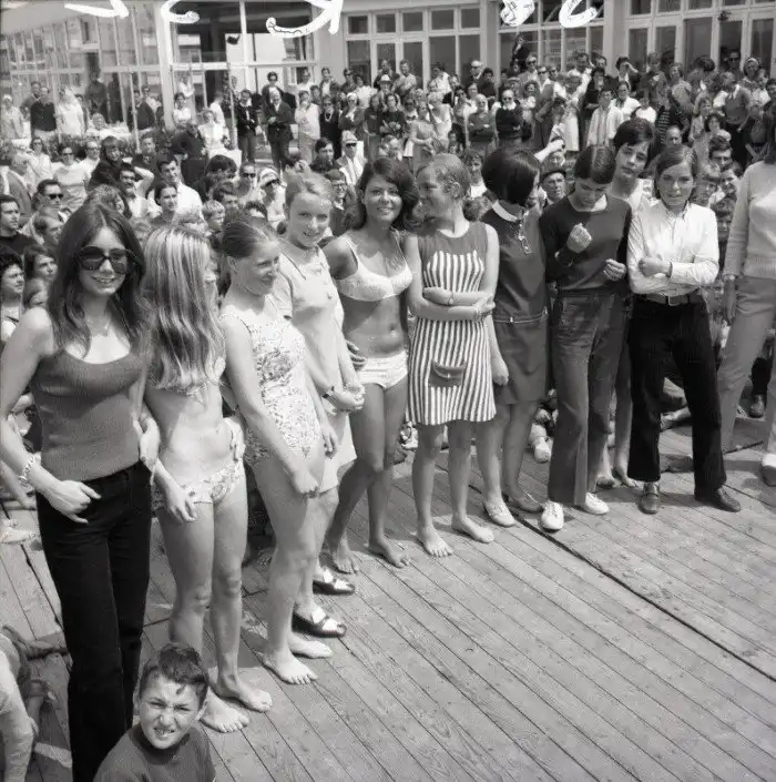 29 июля 1968 года. Франция, Курортный городок Этрет, конкурс "Мисс Этрет". Ставлю на бикини в центре.