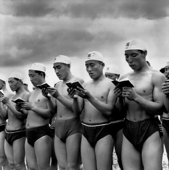 Пловцы читают цитатник Мао перед заплывом в реку Сунгари: отмечают вторую годовщину заплыва Мао через Янцзы.