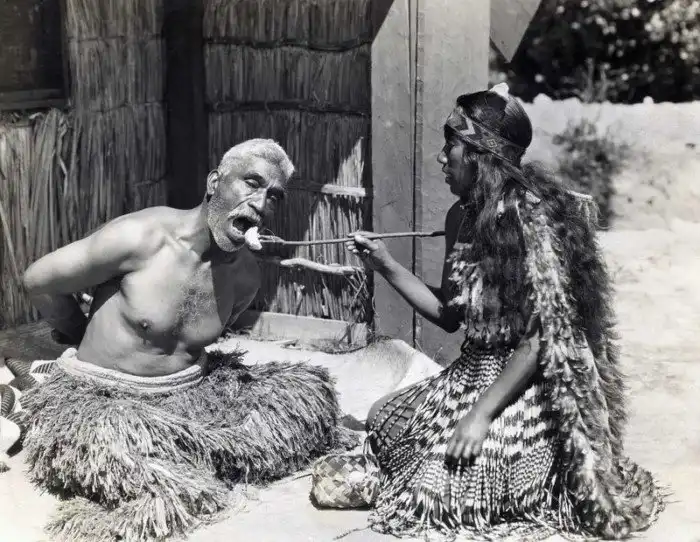 Врач и по совместительству шаман Маори кормит жителя Новой Зеландии, 1930