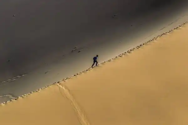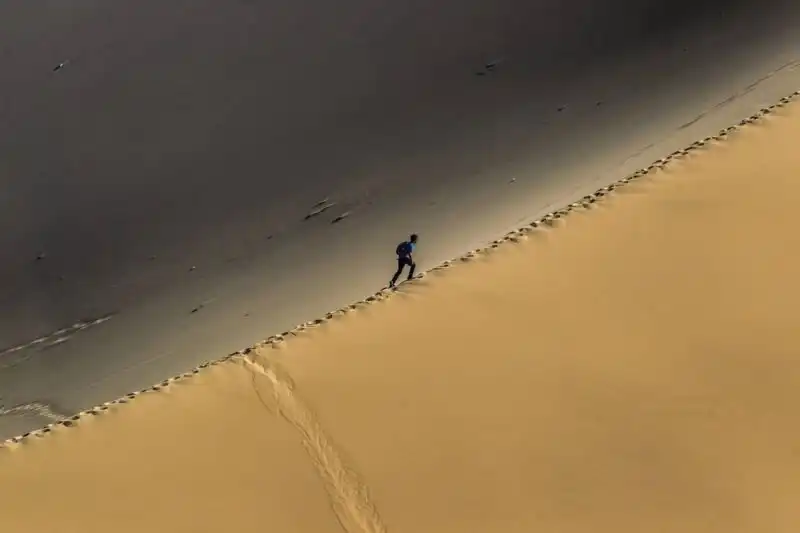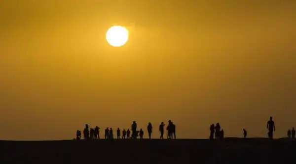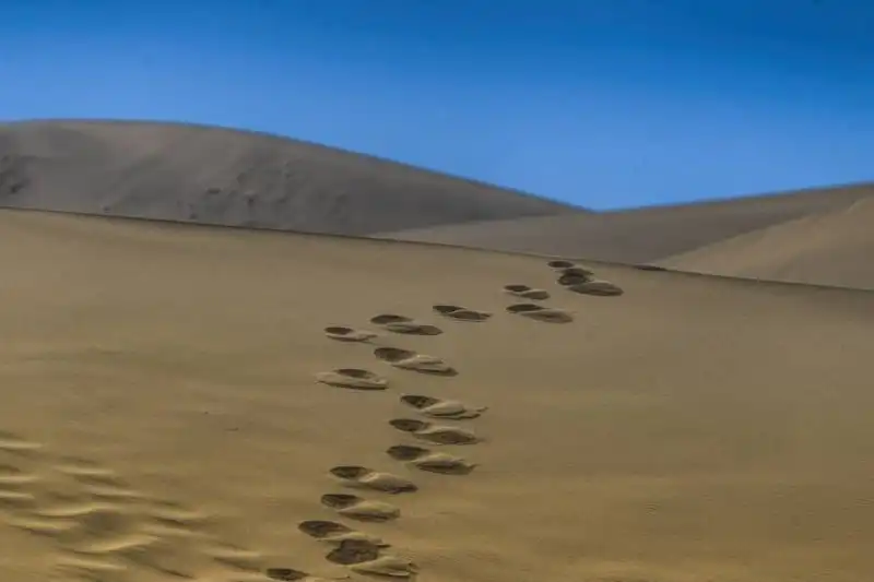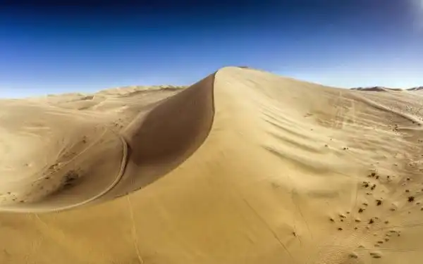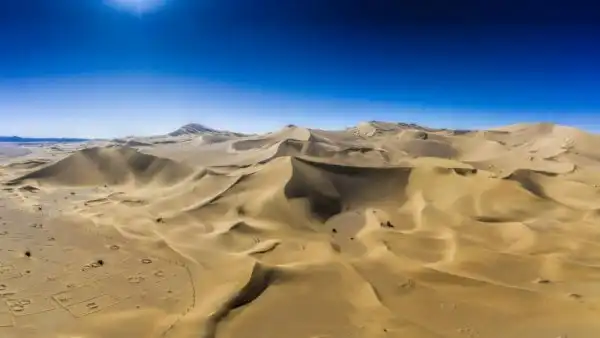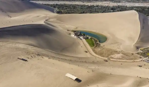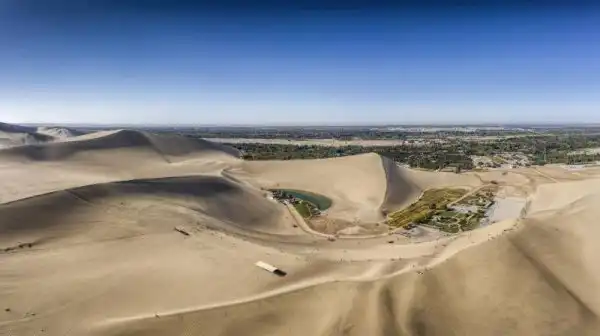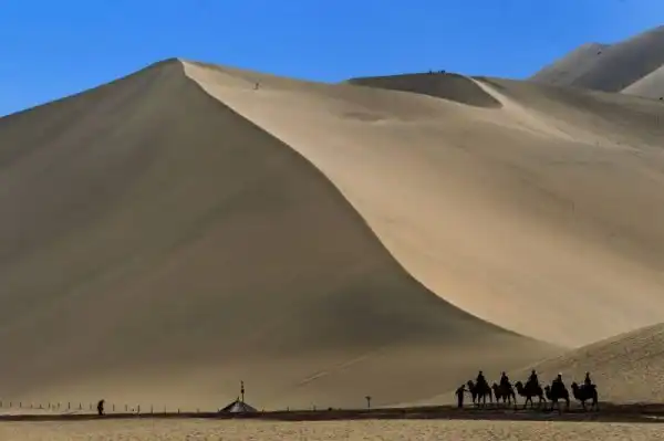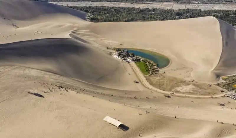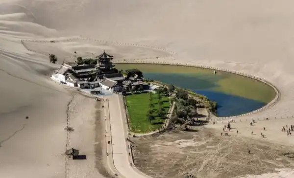 В китайском городском округе Цзюцюань у подножья дюны находится удивительно красивый оазис Дуньхуан. В этом месте с озером и зеленью еще в древности отдыхали караваны после длительного пути по враждебным пескам. В древние времена оазис был воротами в Китай на Великом шелковом пути.
