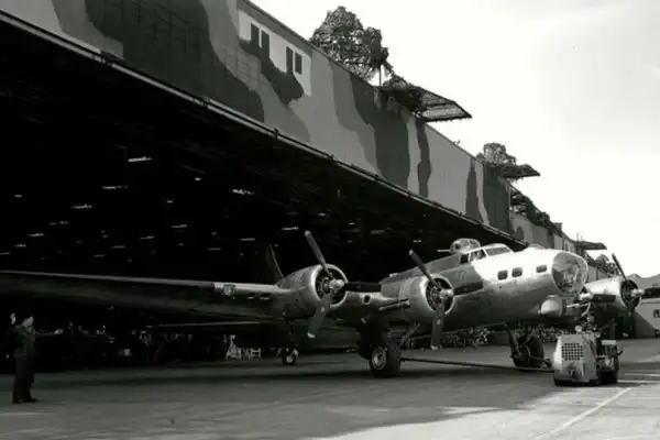 Под фальшивым районом 30 000 мужчин и женщин строили около 300 бомбардировщиков в месяц для борьбы с нацистами. Боевые B-17 Flying Fortresses сбросили более 640 000 тонн бомб над Германией.