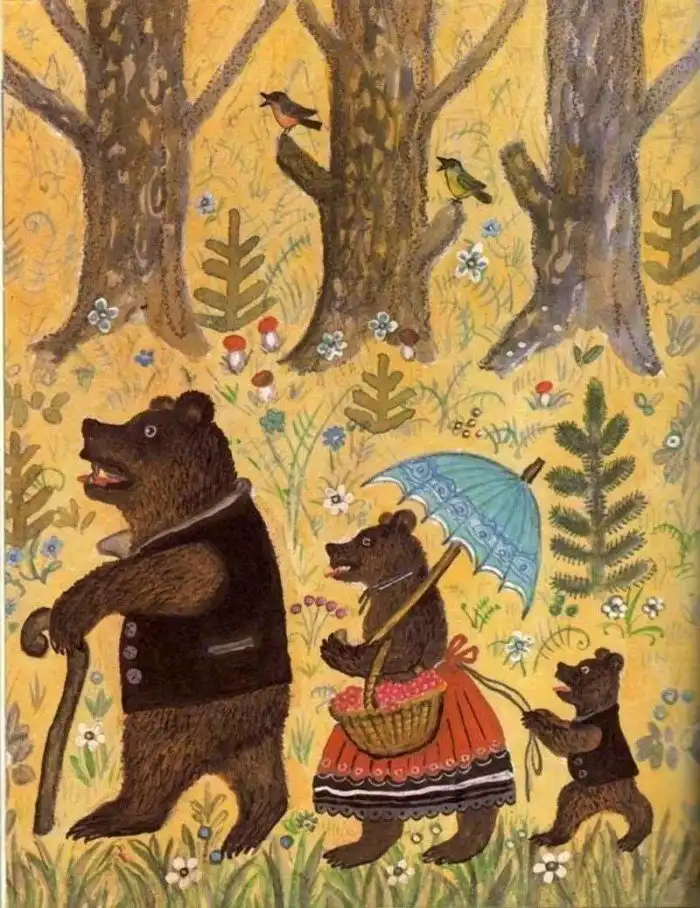 Еще один сюрприз! Казалось бы, что может быть более русским по духу, чем описание дома и быта медвежьей семейки? Ан нет: родиной истории о том, как девочка качалась на мишкином стульчике "и сломала его" оказалась Англия. Там издавна читали малышам сказку «Златовласка и три медведя».