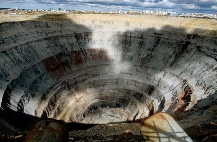 Кимберлитовая трубка «Мир» представляет собой карьер глубиной 525 метра и диаметром 1,2 километра, что делает его одним из самых больших по величине искусственно созданных отверстий на планете. До 2001 года добыча алмазов велась открытым способом, но после обнаружения алмазов на глубине более 1 км. было решено построить подземный рудник. Без рабочих и верениц техники пустующий карьер стал походить на вселяющую страх дыру гигантских размеров, в которую бы запросто мог поместиться поселок.