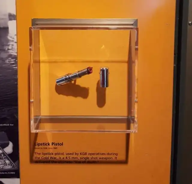 На самом деле, это помада-пистолет времен холодной войны, которая получила название "The Kiss of Death" (Поцелуй смерти). Она использовалась шпионами и сотрудниками КГБ, а представляла собой однозарядное 4,5 мм огнестрельное оружие. Впервые такую необычную помаду американцы отобрали у провалившего свое задание шпиона в 1965 году, а теперь она выставлена в музее холодной войны.