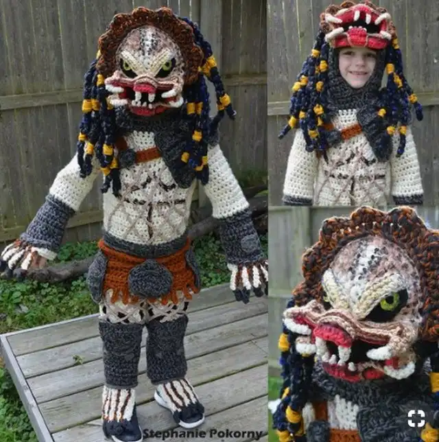 Если вы хотите удивить всех своих знакомых на предстоящем Хэллоуине, можете попросить свою бабулю изготовить для вас вот такой вязанный костюм. Стоит отметить, что все наряды в продолжении поста связаны крючком вручную. Смотрится такое всё очень необычно, но интересно.