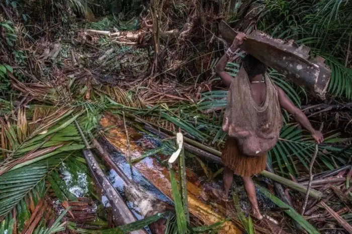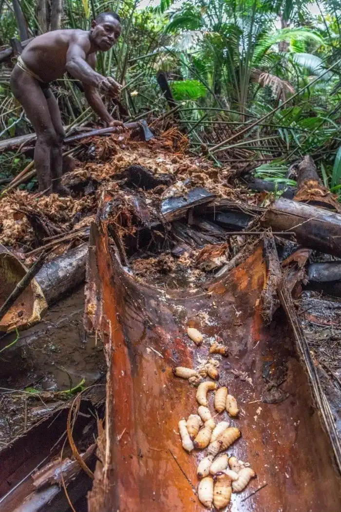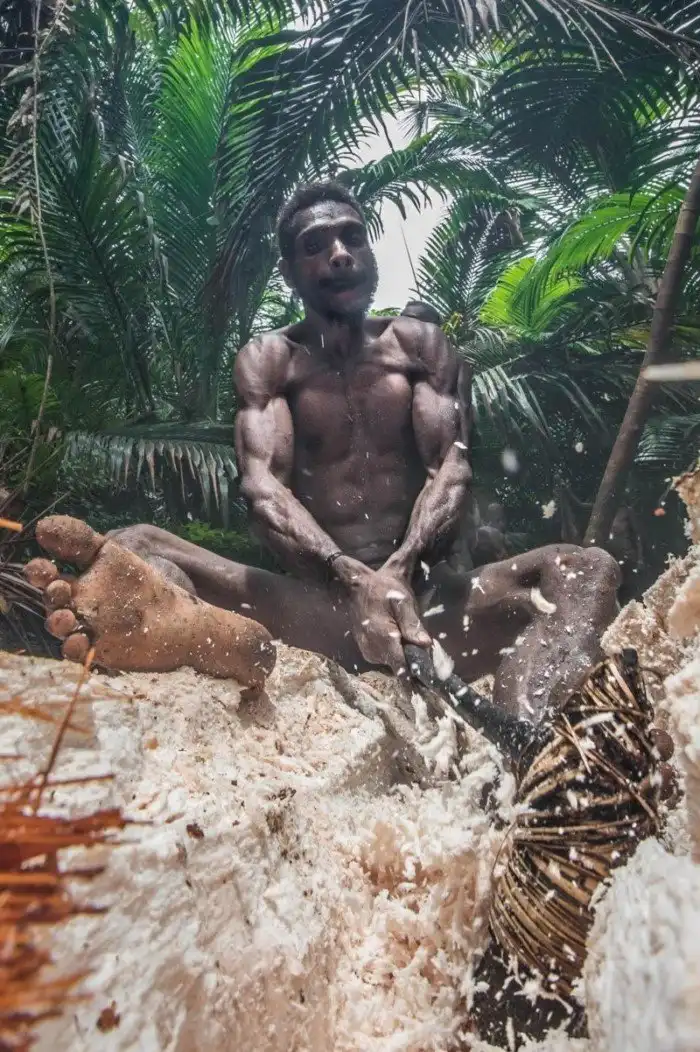 Мужчина обрабатывает саговую пальму для получения саговой крупы - одного из основных продуктов в рационе племени короваи.