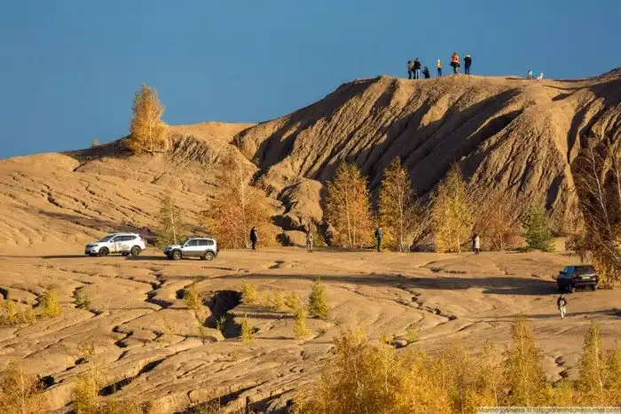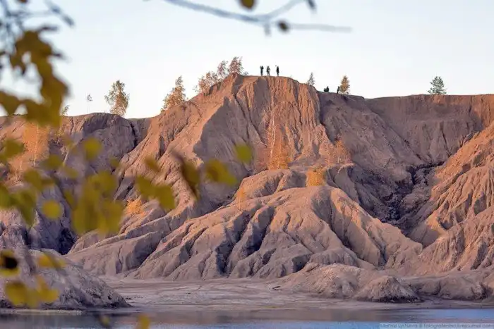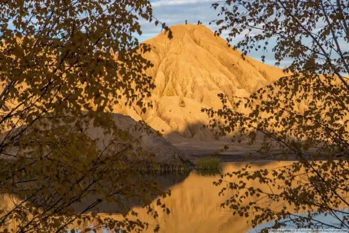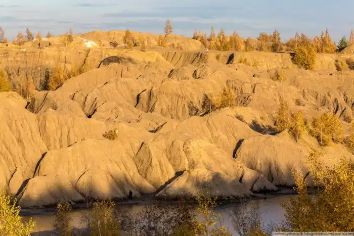 Огромные глиняные отвалы высотой до 50 метров играют на закате всеми оттенками желтого.