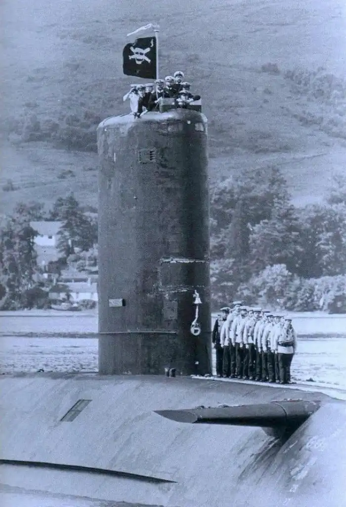 Подводная лодка Ее Величества HMS Conqueror возвращается в Британию после потопления аргентинского крейсера. Фолклендская война. 4 июля 1982 года.