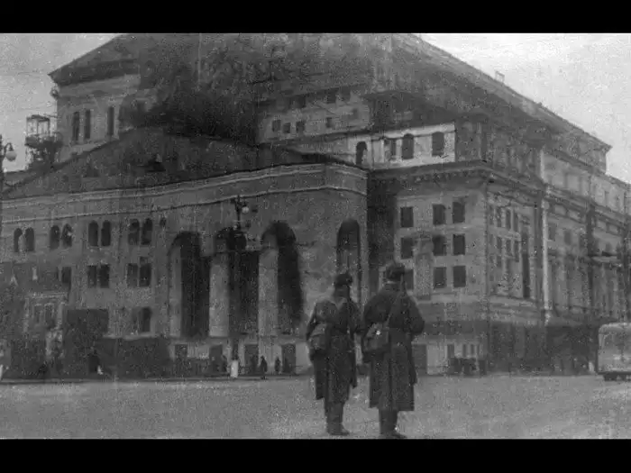 28 октября 1941 года немецкий бомбардировщик сбросил бомбу на центральный подъезд театра, из-за чего снесло фасад здания, обрушили лестницы, пострадал Аполлон и погиб один человек. Странен был выбор места для бомбардировки, так как театр явно не был объектом стратегической важности. Но на этом военная история Большого не закончилась. В 2006 году в одном из театральных подвалов прогремел взрыв – это взорвался артиллерийский снаряд военного времени.