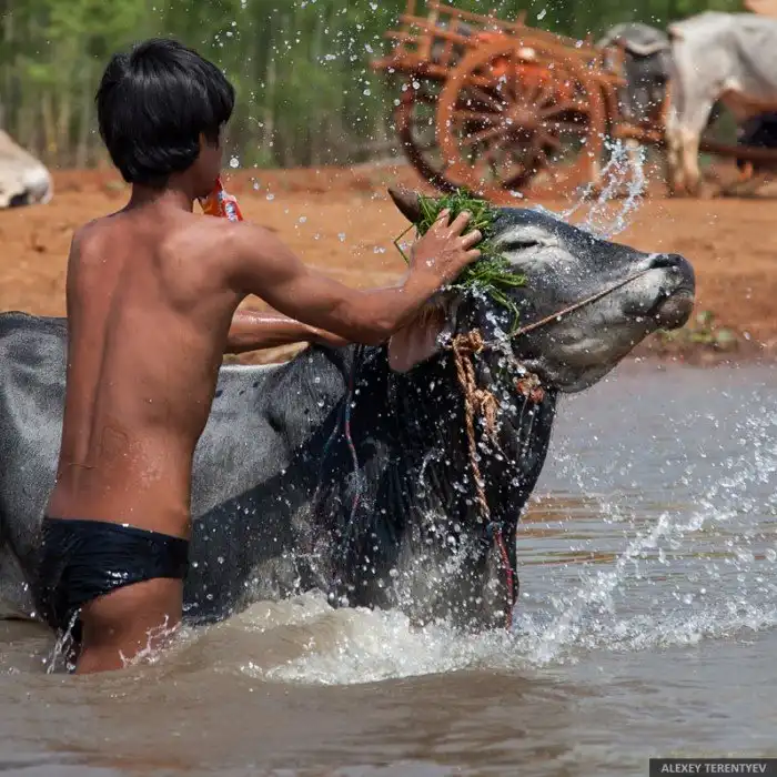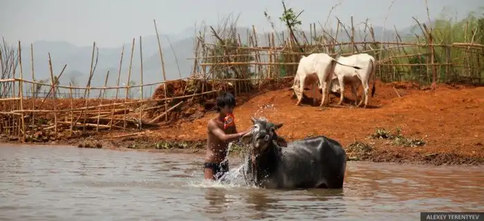 Животных здесь очень любят и купают каждый день. По вечерам коровы и буйволы сами с огромным удовольствием погружаются в прохладную воду озера, чтобы немного охладиться. Однако, заботливые хозяева на этом не успокаиваются, а усердно намывают животных чем-то вроде стирального порошка — так цивилизация приходит и в этот далекий край.