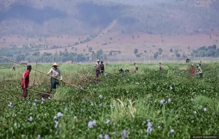 Жизнь на воде не ограничивается рыбной ловлей. На Инле можно найти плавучие деревни, дома на сваях и даже плавучие огороды.