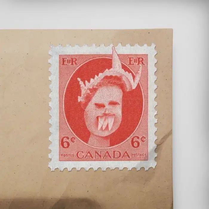 Ничего необычного - просто марка на конверте с изображением Елизаветы Второй (если бы она выглядела, как нарисовал ее Дом).