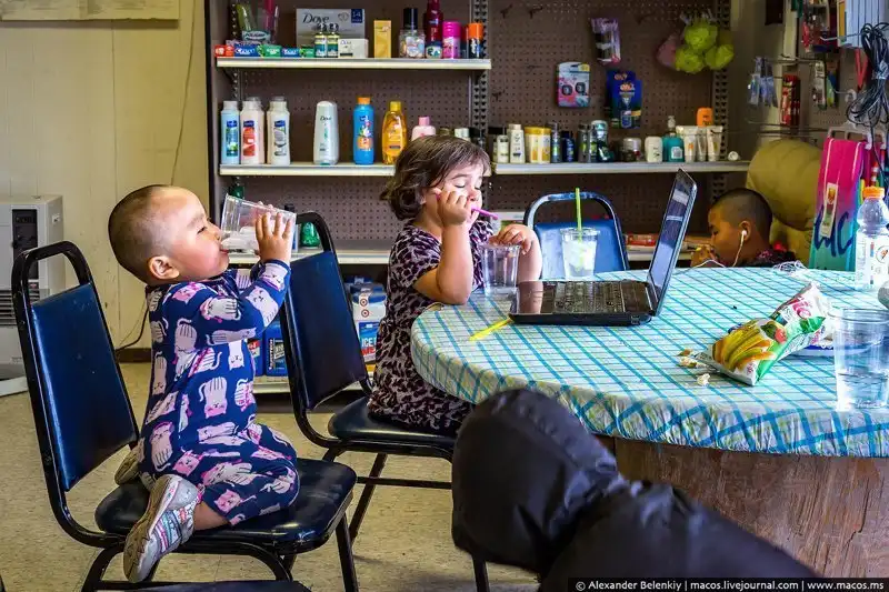 Внутри дом тоже совершенно ничем не отличается от привычных американских домов. Большая гостиная, совмещённая с кухней, несколько спален, ванна с туалетом. Нигде в посёлке "сортиров на улице” замечено не было. У всех канализация и водопровод.