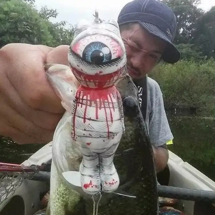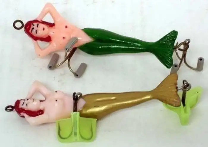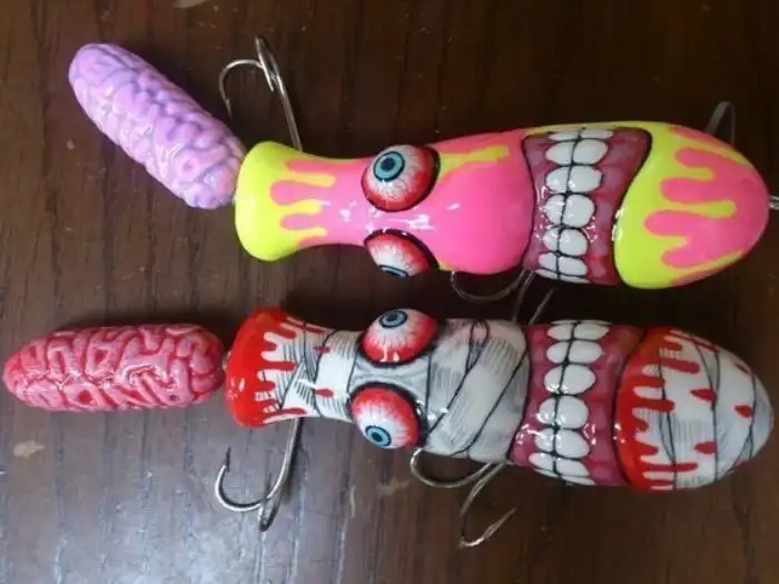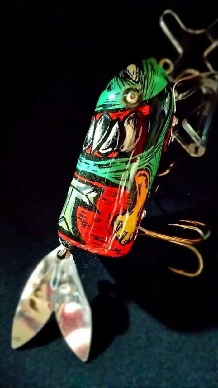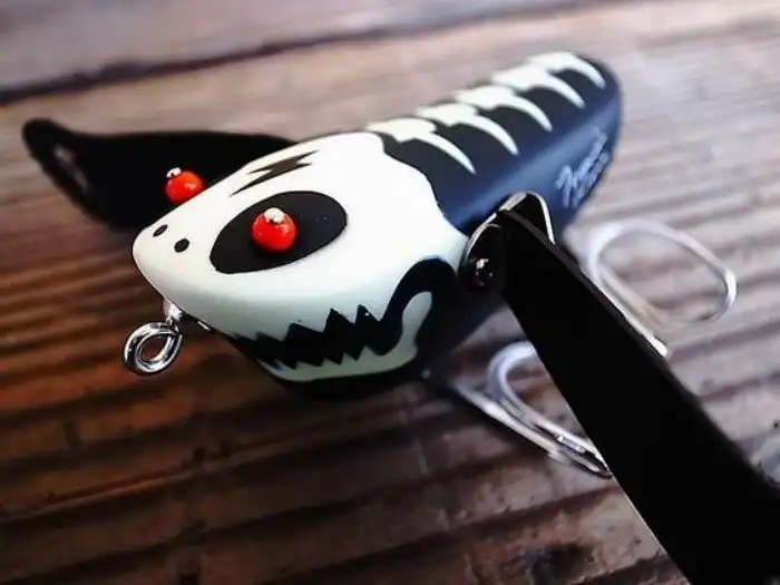 В хвосте и голове приманки находятся впаянные жалом вверх одинарные крючки, также имеются две петельки для крепления лески, и для дополнительного тройника и стабилизатор в её хвостовой части.